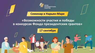 17 сентября в Нарьян-Маре с 17.30 до 20.30 Фонд президентских грантов проведёт очный семинар «Возможности участия и победы в конкурсах Фонда президентских грантов» для некоммерческих организаций в Ненецком автономном округе. Ведущая: Анна Никифорова, генеральный директор автономной некоммерческой организации «Школа управления некоммерческими организациями Фонда президентских грантов».